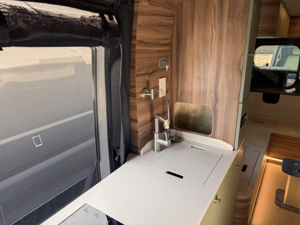 Lori and I both liked the Walnut/Sage (despite living in California) but were concerned that it would be too dark. In videos, the walnut/sage looks great, but of course, the camera is adjusting its exposure, perhaps giving a misleading image. You can photograph a cave by candlelight, after all, and make it look as bright as you want. However, in person, the Walnut/Sagewas not that much darker than the Scandinavian at all, no doubt helped by the spacious feeling the interior of the van offers with its seven-foot ceilings.