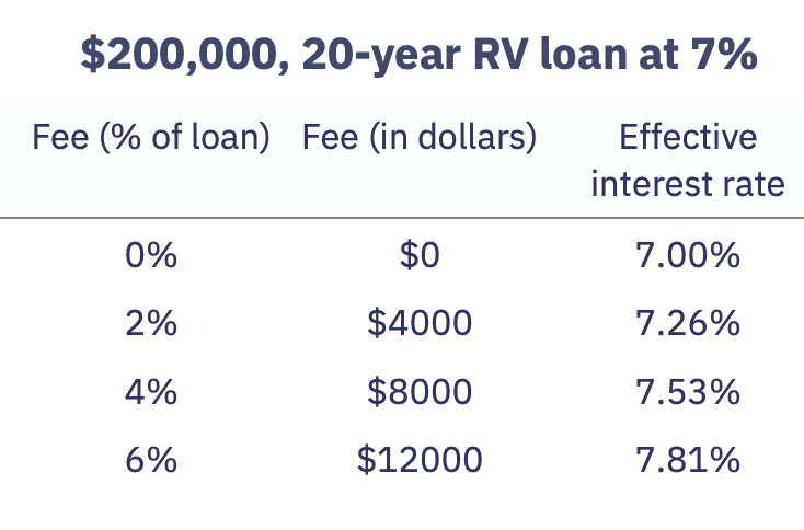 Fees are the great hidden cost of RV loans, and of consumer loans in general. It’s a massive profit center for lenders as borrowers often pay no attention to fees at all, despite the fees usually running into the thousands of dollars. On an RV loan, the fees are usually quoted as a percentage of the loan and run from 6% down to zero, with 2% being common. Two percent of $200,000 is $4000 in fees. That’s a lot of money for pushing paper.