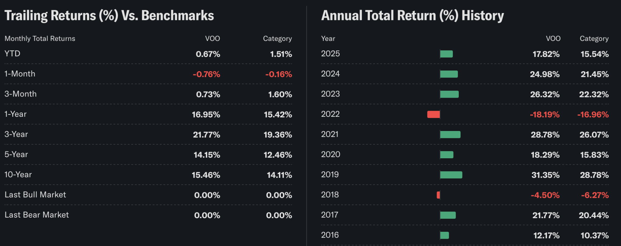 Consider VOO, a boring Vanguard S&P index fund. Here are its returns from the past ten years.